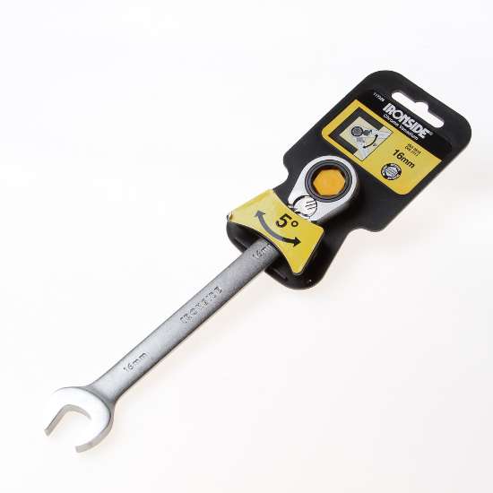 Chroom-vanadiumstaal met omstelbare ringratel, actiehoek 5°, steeksleutel 15° gebogen.